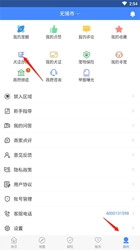 1首先打开软件,接着点击“我的”选项,随后再点击“犬证办理”选项。