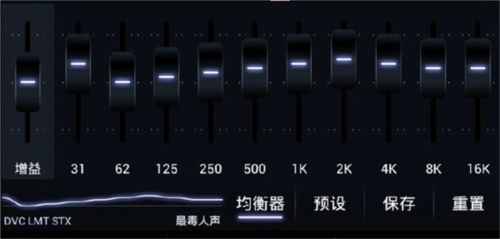 三、第三个均衡器,我把它叫做“最毒人声”。之所以这样称呼,是因为该均衡器设置下,中频人声极为突出。然而,此均衡器设置的三频又相当均衡,同样具备清丽通透的特点,听感十分舒适,让人长时间聆听也不会感到疲倦。从左至右具体参数为:增益:0;第一频段:+4;第二频段:0;第三频段:+1;第四频段:+2;第五频段:+3;第六频段:+4;第七频段:+5;第八频段:+4;第九频段:+3;第十频段:+3 。