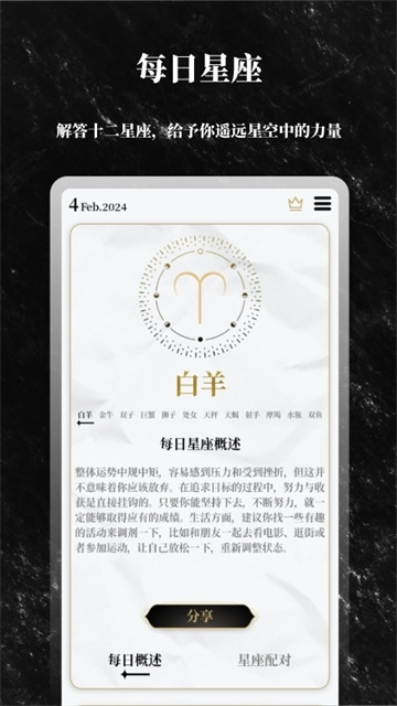 《答案之书》是一款专为喜爱星座等内容的用户打造的软件。它拥有海量治愈文字,在你处于低谷时给予慰藉。同时,软件内有各类丰富音频可供收听,能治愈你内心的美好。用户每天都能查看星座解析,随时知晓今日运势。此外,还能制作方向转盘,当你面临两难抉择时,助力你做出决定。这无疑是一款十分出色的软件。