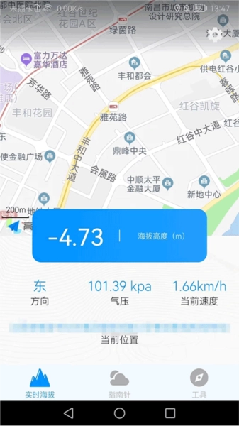 2、回到软件的实时海拔页面,在此页面你能够看到自己当下所处的位置、方向以及气压等详细信息。