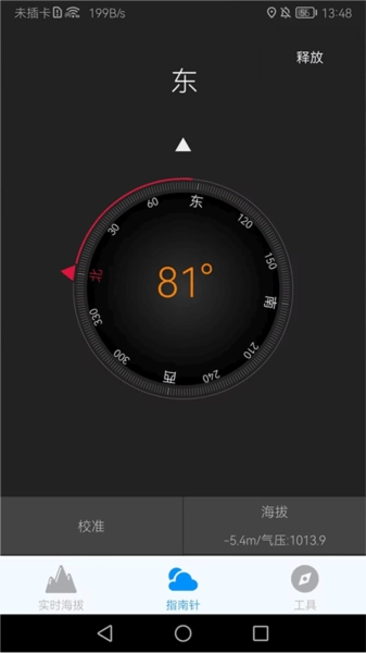 3、指南针能够精确地指引方向,与此同时,该页面还会展示海拔以及气压信息。