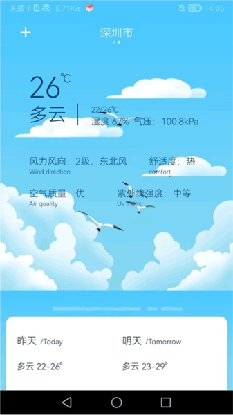 6、在天气预报页面滑动屏幕,就能查看自己所在城市的天气状况。