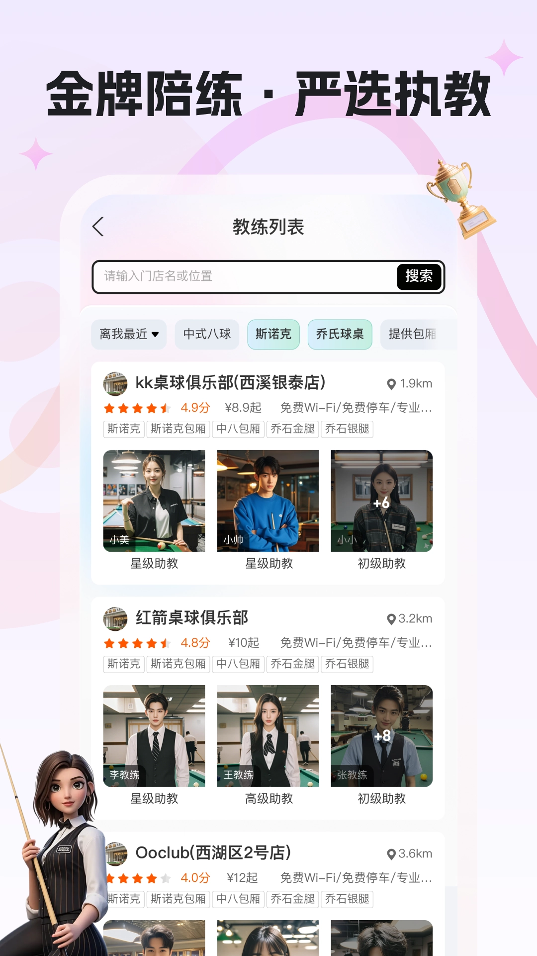为用户配备专业认证教练,其中金牌教练将从多个维度提升用户的台球技巧。