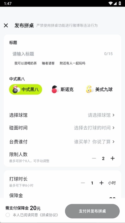 支持用户寻找所需的助教陪练,还能找到志同道合的搭子,一同轻松地进行台球陪练,人数可随时配置。