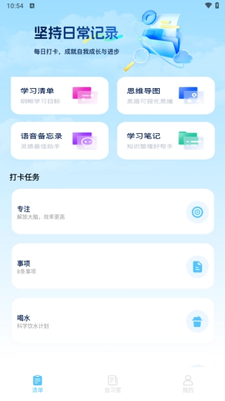 2. 打开软件进入首页,这里提供了学习清单、思维导图、自习室等工具,供用户使用。