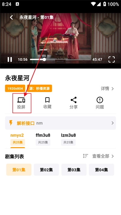 4、投屏时,我们还能在下方对投屏接口进行切换,以及选择剧集等。