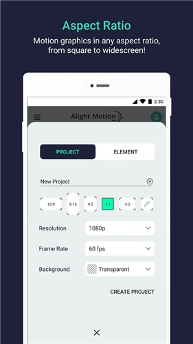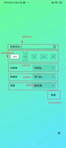2、然后我们选择创建一个项目,设置项目名称、宽高比例、分辨率、帧速率、背景颜色;