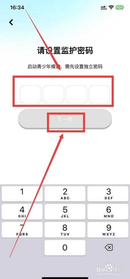 4、最后一步,输入监护密码,接着点击下一步,就能开启青少年模式。