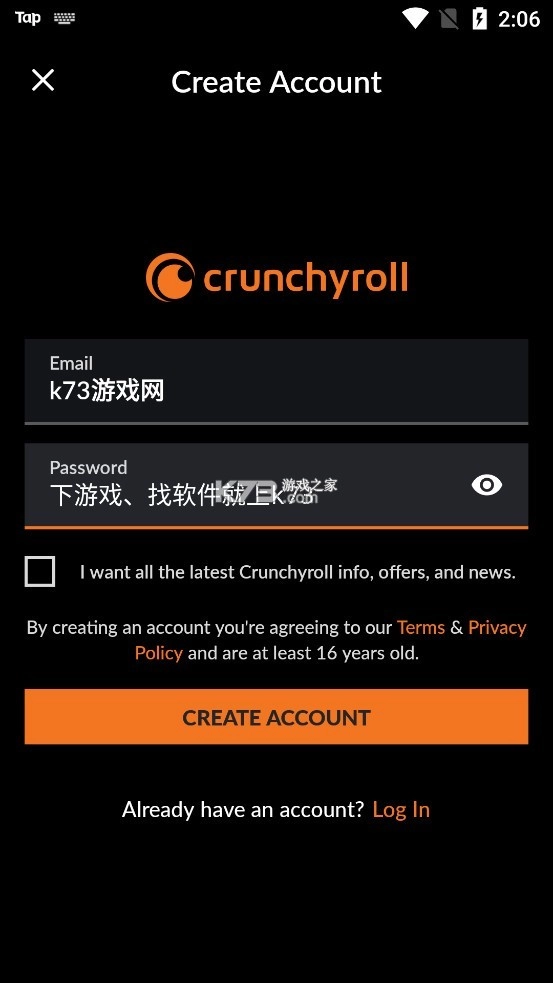 1. 安装Crunchyroll软件后,打开该软件,点击屏幕上的“CREATE ACCOUNT”。要是之前已经注册过账号,那么可直接选择“LOGIN”登录。