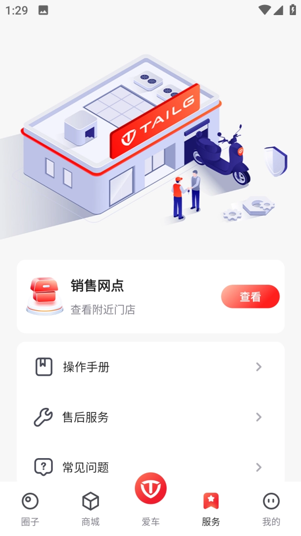 3、点击“服务”,在此处可看到销售网点、安全定位、常见问题等服务选项。