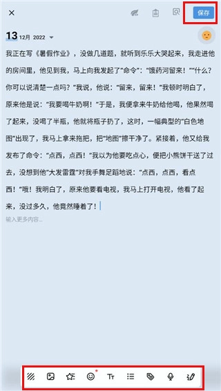 2、接下来就可以写笔记了,底栏有各种书写工具,可以更换背景,插入图片,调节字体大小等,写完点击保存即可