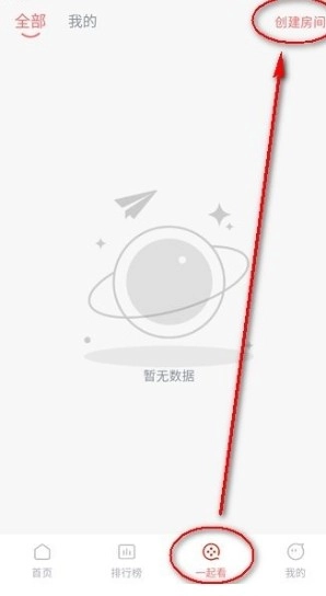 2、点击底部的“一起看”选项,进入后能看到其他用户创建的一起看房间;你也能够自行创建房间。