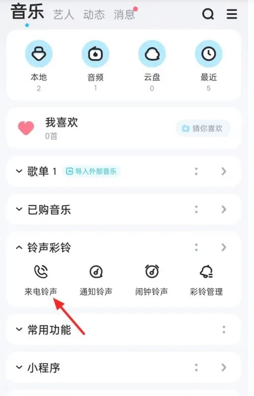 在酷狗音乐的“我的”界面,点击“来电铃声”选项。