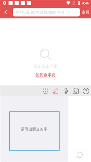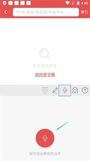 3、提供语音与拍照查询功能。若使用语音查询,点击方框内的话筒图标,按住后说出想要查询的汉字即可。