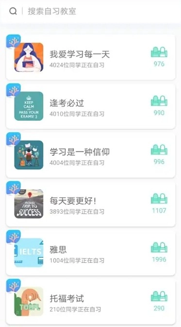 3、首先点击自习室,依据自己的需求加入线上自习室,和其他小伙伴一起学习。
