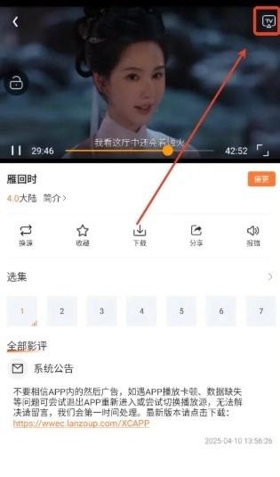 2、在香葱追剧最新版本的播放界面,点击右上角的TV投屏。