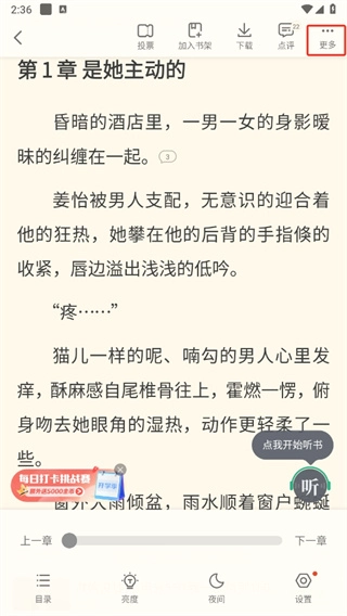 2、接着打开小说,进入详情页面,点击页面中间位置,随后点击右上角的【更多】。