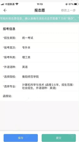 在“填写报名信息”页面,“保存”按钮仅保存本页面的信息,而“提交”按钮不仅会保存页面信息,还会同时进入到下一个环节。