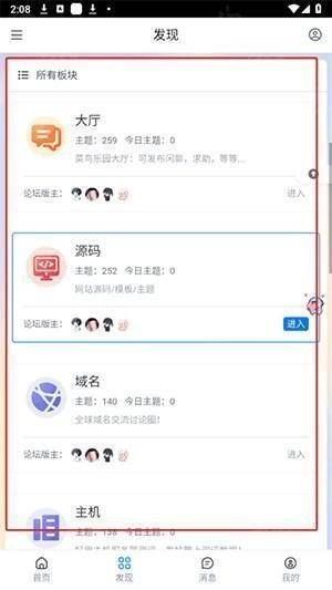 2. 在发现页面,能够浏览到所有版块的相关内容,像源码、域名、主机等。