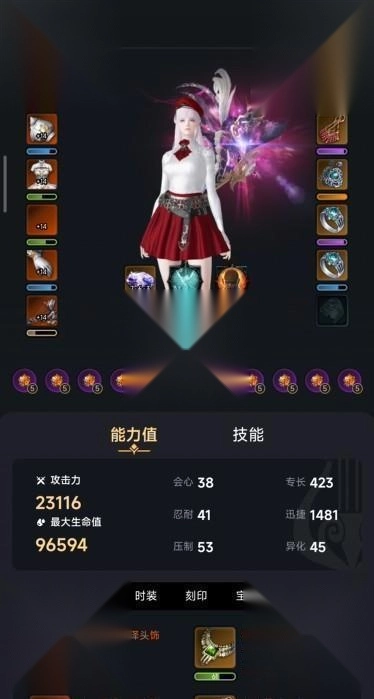 点击自身的角色卡片,即可查看自己角色的详细信息,其中涵盖装备、能力值、技能加点、每件装备的品质、时装、宝石等各类信息。