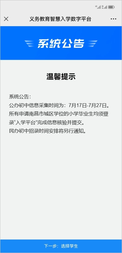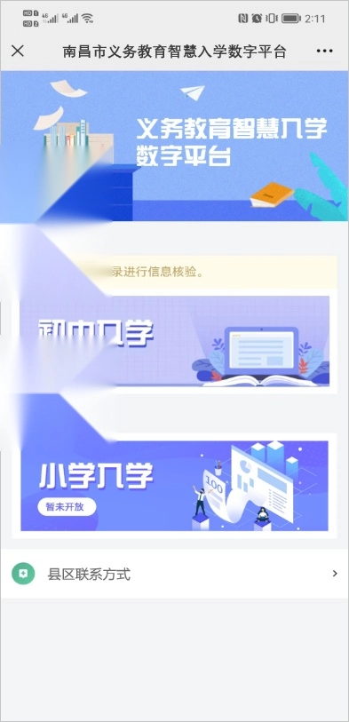 9、完成登录认证。在“南昌市义务教育智慧入学数字平台”上线后,点击首页的“智慧入学”选项,开展入学信息核验工作。