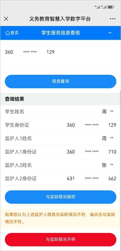 成功查询学生信息后,能够查看学生及其监护人的基本信息。在确认信息准确无误后,点击“与实际情况相符”。