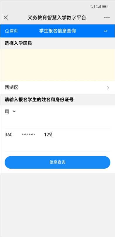 操作流程如下:监护人需选择入学县区(注意要选择与房产对应的初中学校所在的县区),接着输入学生姓名及身份证号,最后点击“信息查询”。 图片图片