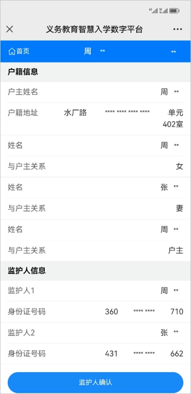操作流程如下:首先核查户籍信息有无错误,若信息准确无误,点击“监护人确认”进入下一步;要是监护人信息和实际情况不一致,可依据家庭的真实状况来操作。