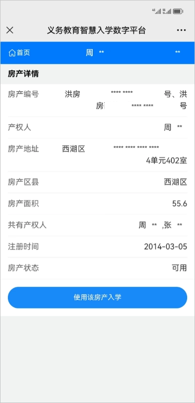 2. 查阅房产详细信息,在确认房产信息准确无误之后,点击“使用该房产入学”。