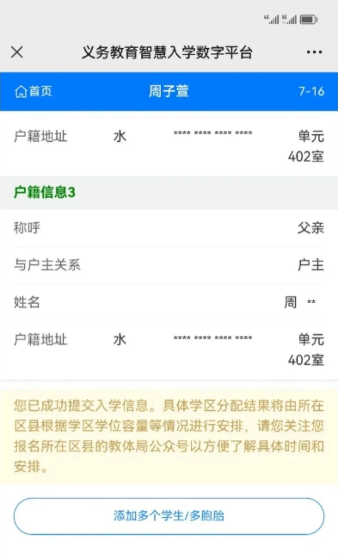 若有多胞胎小孩,可添加多胞胎入学相关信息;点击“添加多个学生/多胞胎”,开展入学登记工作。