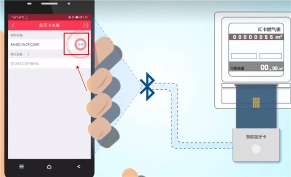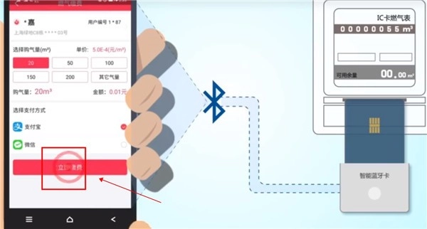 4. 进入下一步后,选择所需购气量(单位:立方,一般最少20立方),点击下方“立即缴费”,即可显示蓝牙卡充气成功。