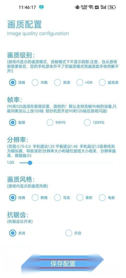 2. 能够对和平精英的画质级别、帧率、分辨率、画质风格、抗锯齿、材质级别等进行选择,选择完成后点击保存配置。
