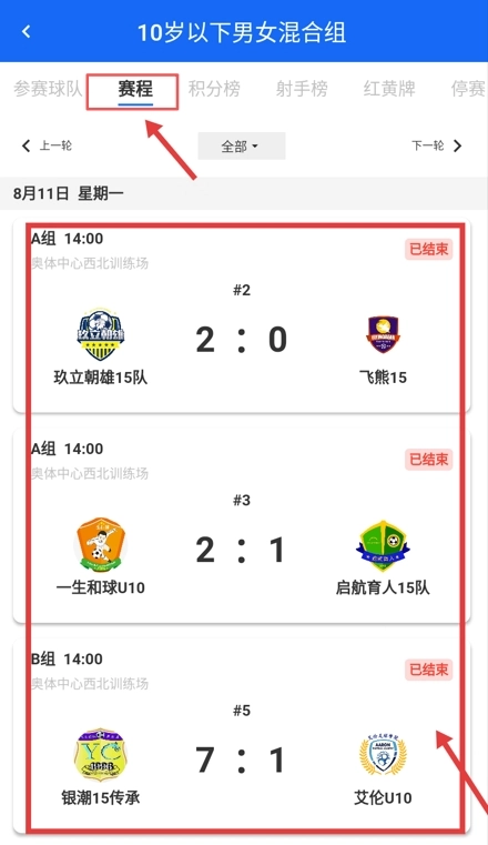4、于分组信息页面内,点击赛程标签,即可查看该组别的具体赛事赛程信息,知悉比赛安排。
