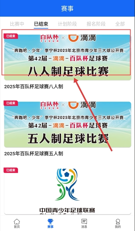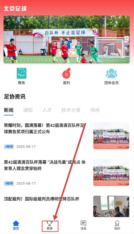 1、进入“北京足球”应用,在底部导航栏中找到“赛事”选项并点击,随即进入北京足球赛事列表页面。