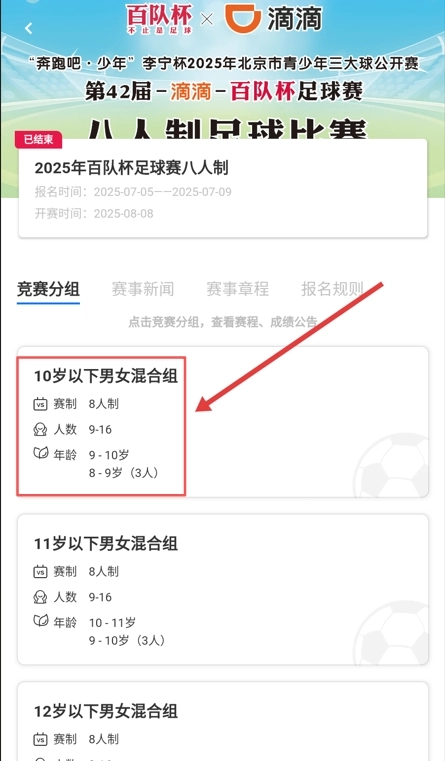 3、当进入赛事详情页面后,在页面中寻找10岁以下男女混合组的竞赛分组信息,找到后点击该信息,即可进入对应的分组页面。