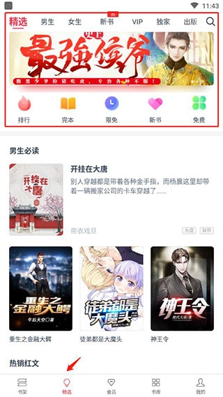2、进入后,在精选板块为大家呈现了各类小说推荐,这里简直是书荒党的福音之地。