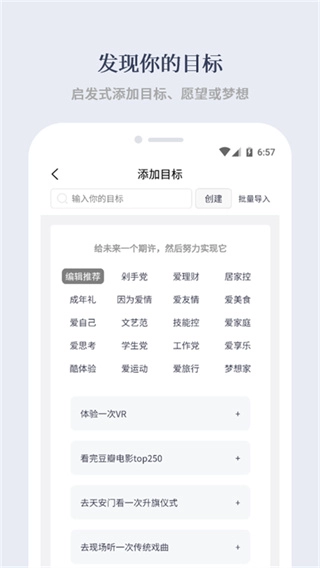 你既能够添加系统已有的条目,也可以自行创建全新条目。同时,还能进行分组划分、设置提醒以及设定隐私状态等操作。不仅如此,针对目标可以标记完成状态,针对习惯能够进行打卡,并且还能发布动态。另外,对于习惯,还能查看其历史数据统计以及月度数据统计。