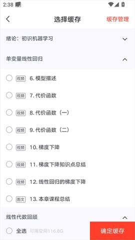 4、最后挑选心仪的课程章节,点击“确定缓存”,如此便能在任意时间、任意地点进行学习。