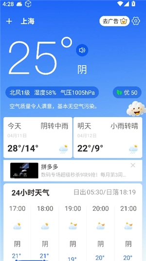 2、以上海为例,在此将为你呈现温度、湿度、24小时天气变化情况、未来40天的天气状况以及空气指数等信息。