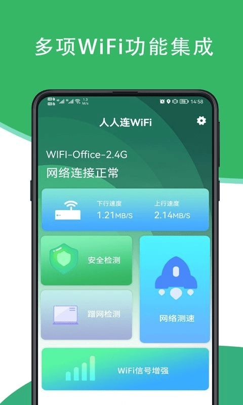 人人连WIFI是一款极为好用的辅助上网平台。借助它,用户能够免费且安全地上网。该软件具备智能检测网络信号的能力,还能自动识别wifi,全方位保障网络使用的安全性。不仅如此,软件可直接搜索附近的共享网络,便捷程度极高。同时,软件内拥有十分强大的wifi管理功能,实用性超强。