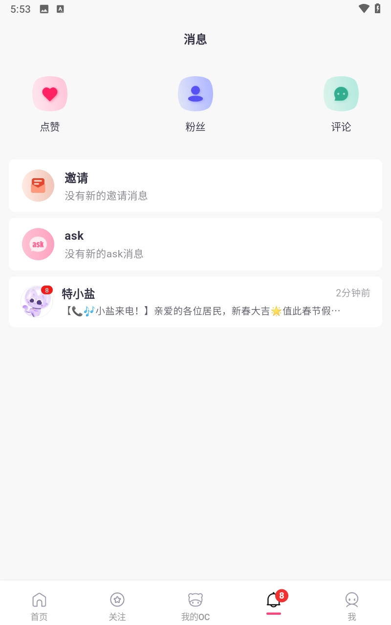 在此处,你能够看到消息通知、OC关系邀请以及社交互动信息。千万留意,别错过精彩活动哦。