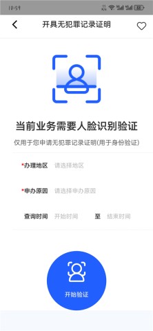 3、在申请过程中需进行人脸识别验证,选择办理地区、申办原因以及查询时间(受理地类型可以选择“户籍地”或“居住地”)。选择好后点击“开始验证”。