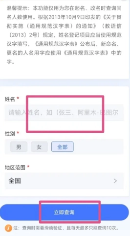 2、随后输入您的姓名,点击“立即查询”,就能获取同名人数的相关信息。