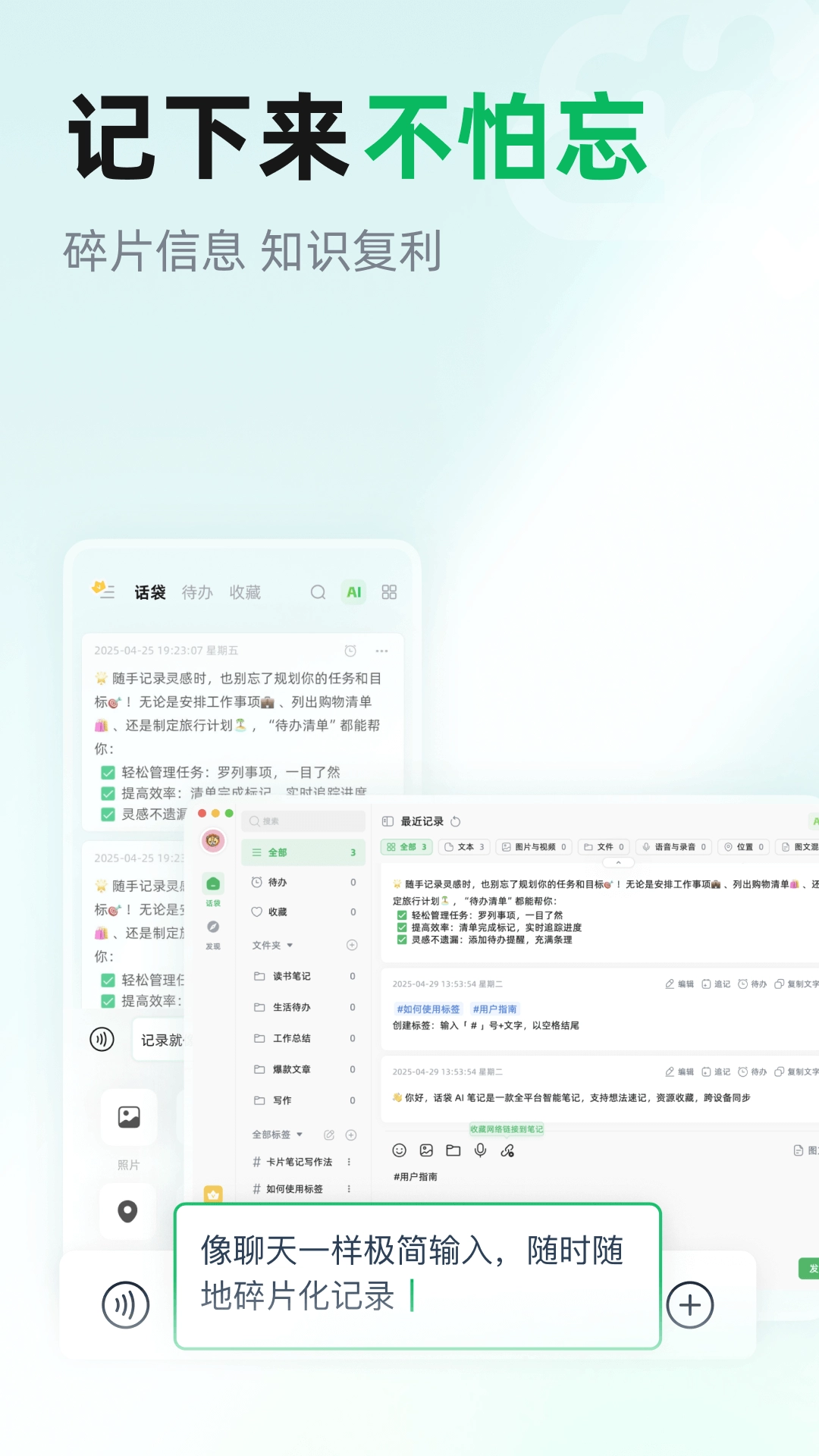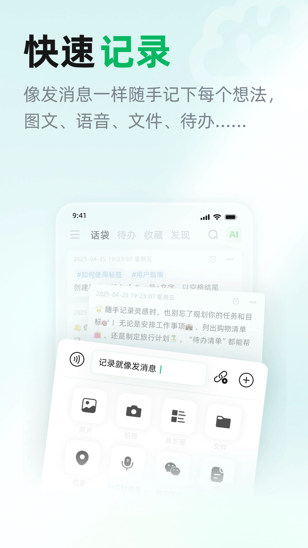 如同发消息那般,轻松随手记录下每一个想法,无论是图文、语音、文件,还是待办事项……