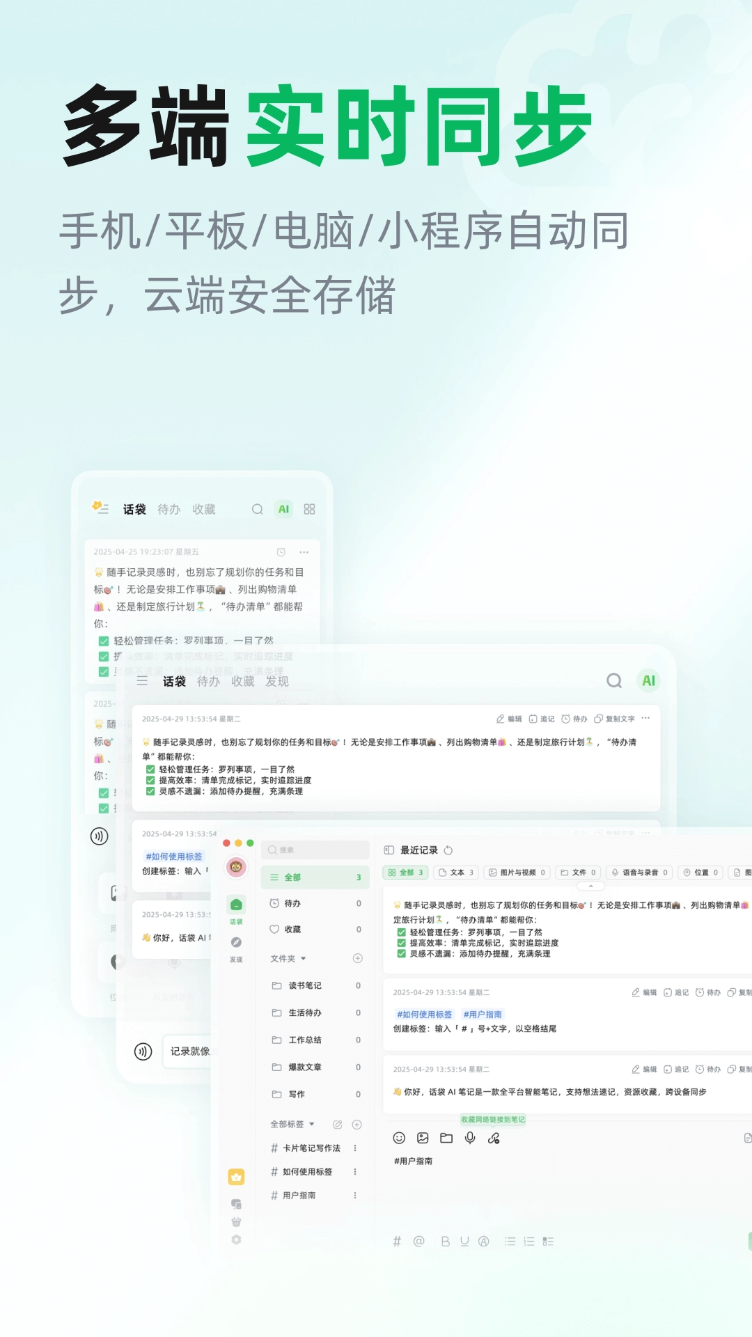 手机、平板、电脑与小程序实现自动同步,数据于云端进行安全存储。