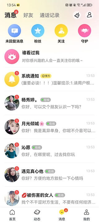 4、消息用户点击屏幕下方的消息,可以进入到消息界面,界面内有未回复消息、粉丝、守护、关注四个功能。也可以查看好友消息,以及通话记录。