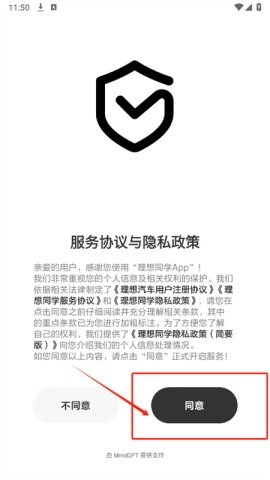 2. 打开后需同意服务协议与隐私政策。