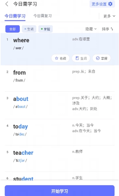 4、完成后点击开始学习即可查看今日需要学习的内容