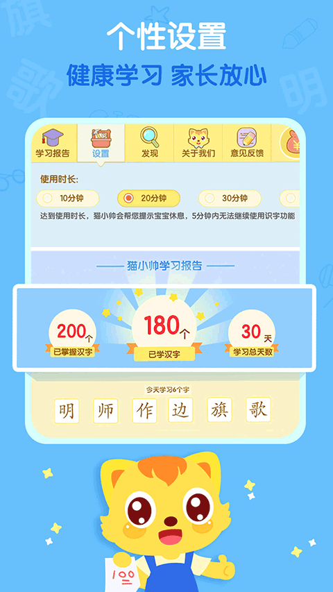 软件整体的画面偏卡通一些,这样能更好的吸引到小朋友的兴趣,软件内涵盖了字学习,拼音学习、早期阅读、汉字书写、古诗等多种启蒙学习,非常的全面,无论大家想让自家小朋友学习汉字启蒙、拼音启蒙还是书写汉字,用它准没错,如果你也在因为自家小神兽太过顽皮不愿意学认字的话,不妨这款猫小帅识字试试,相信它能够帮助你。