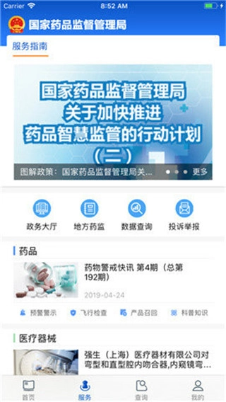 2、点击服务,里面为用户提供了政务大厅、敌方药监、数据查询等等优质服务;